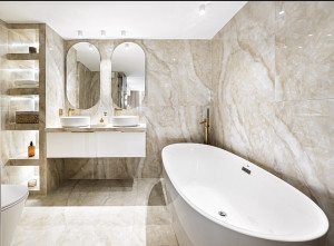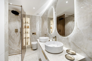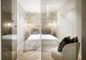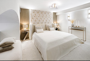 A pasztelltónusok, a textíliák és a világítástechnika exkluzív, mégis otthonos atmoszférát teremtenek.